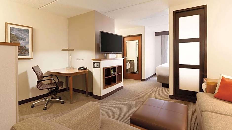 This room features a 42-inch flat screen TV, a desk and a sleeper sofa.